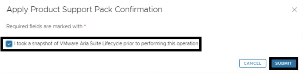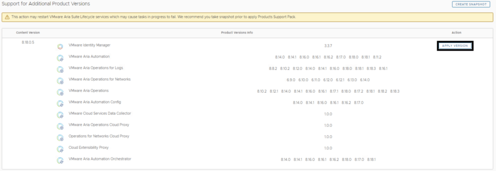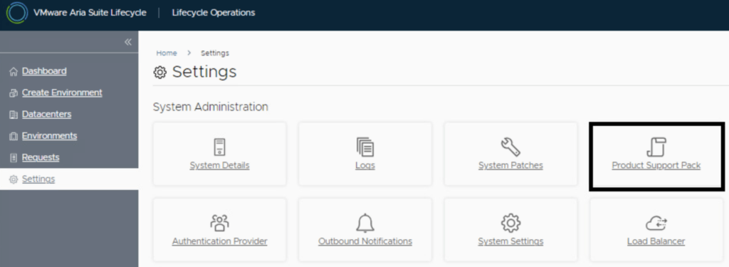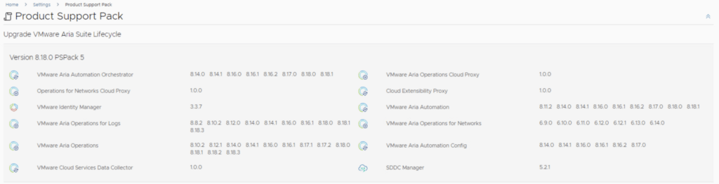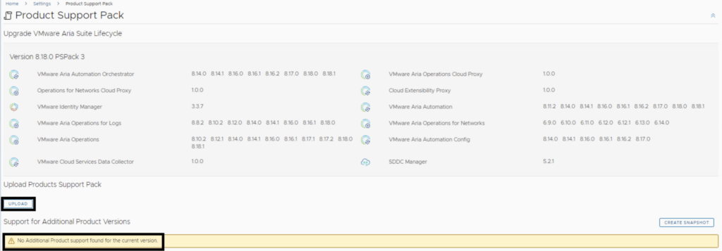 Jumping back to Aria Suite Lifecycle, we can see that the are no Product Support Packs available