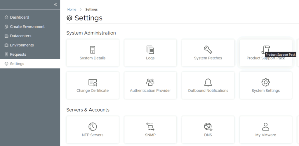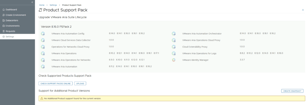 In this guide i will go over the manual steps of getting an existing 8.x Aria Suite Lifecycle appliance to support the latest product releases available. Here is a great blog that goes in to the details about what the Product Support Pack is https://blogs.vmware.com/management/2019/01/vrslcm-pspak.html. Typically the newer Product Support Pack is included part of the upgrade for Aria Suite Lifecycle, however sometimes there are product releases in between releases where product support packs come in handy. As of 8.16.0 Product Support Pack 4 we can no longer automatically download the Product Support Pack files. The release notes can be found here.