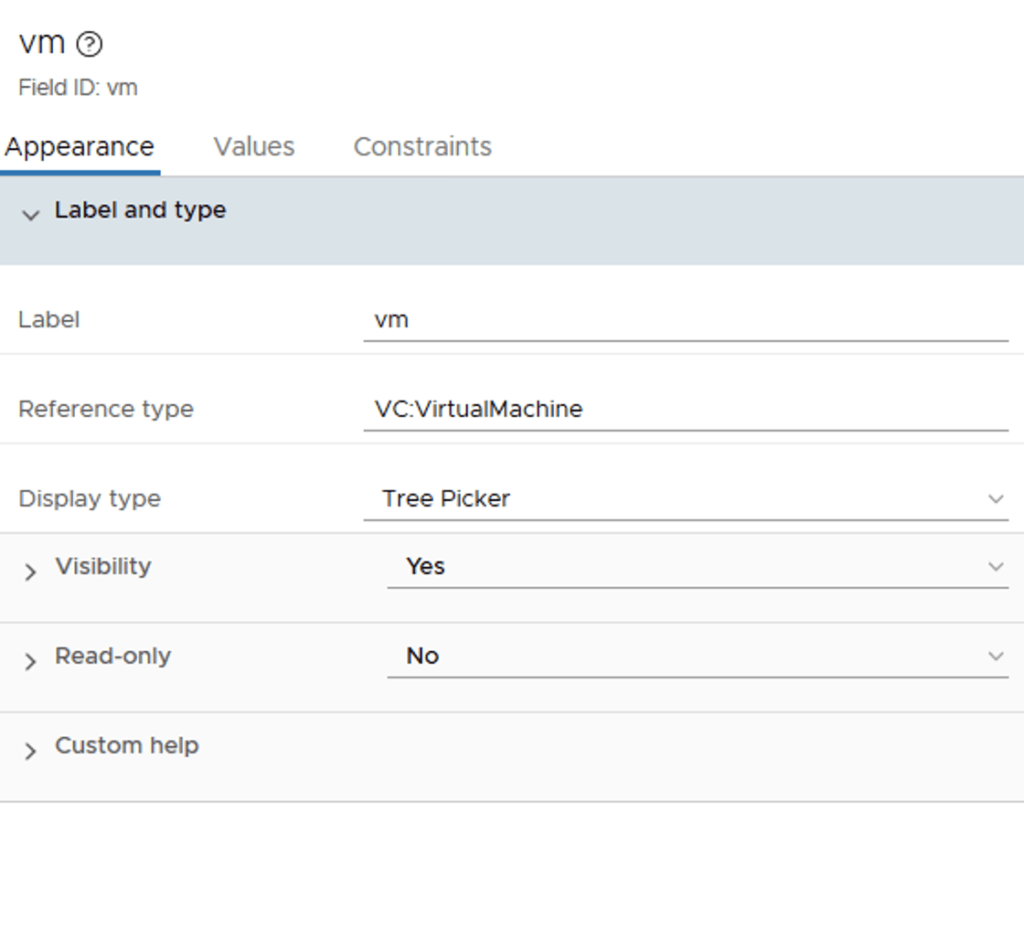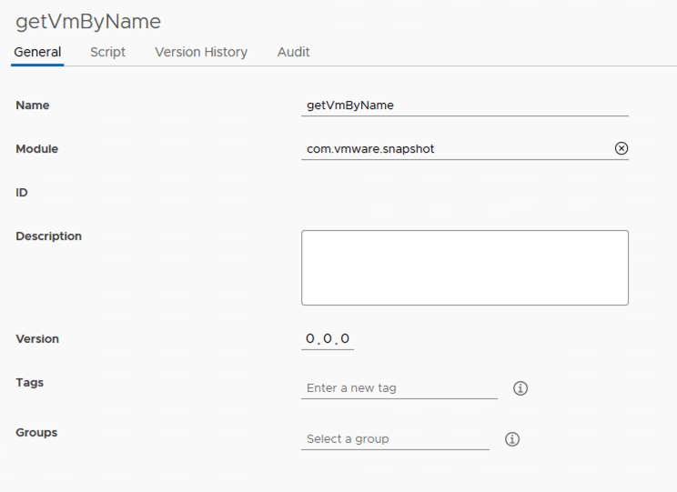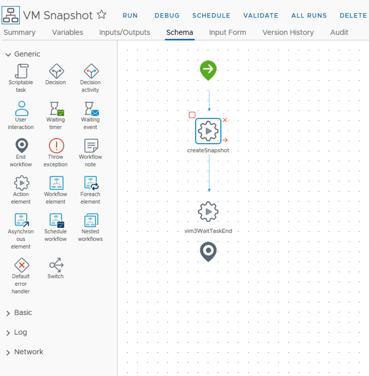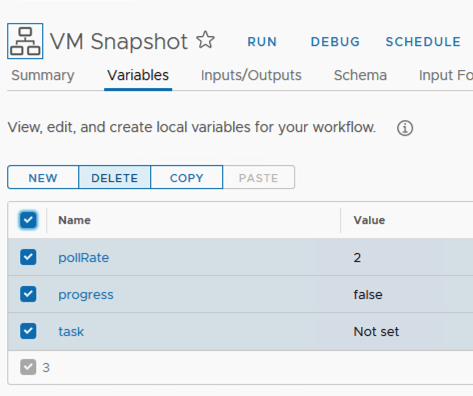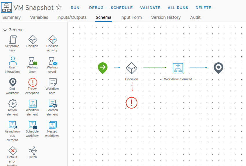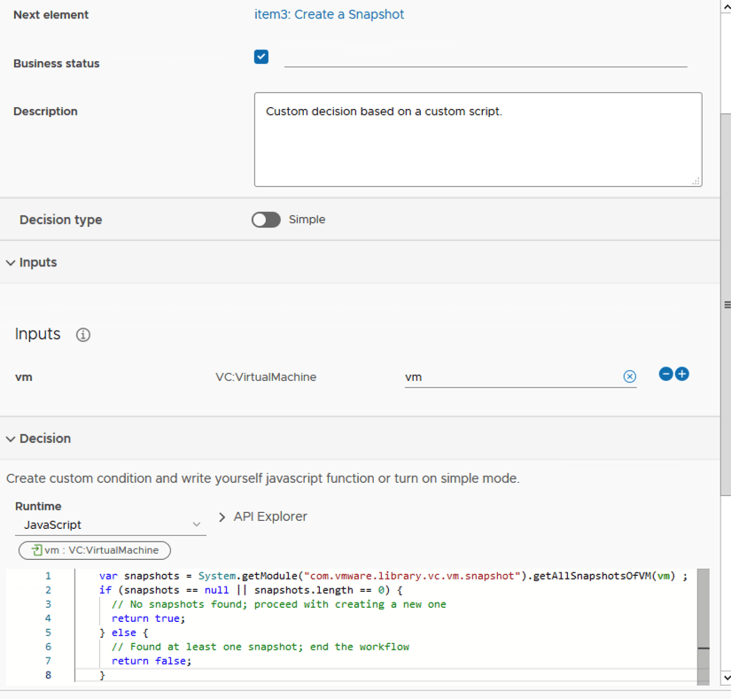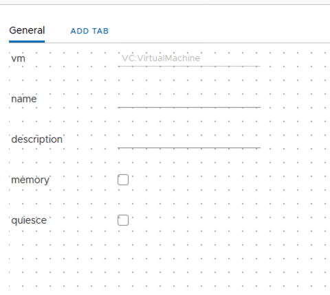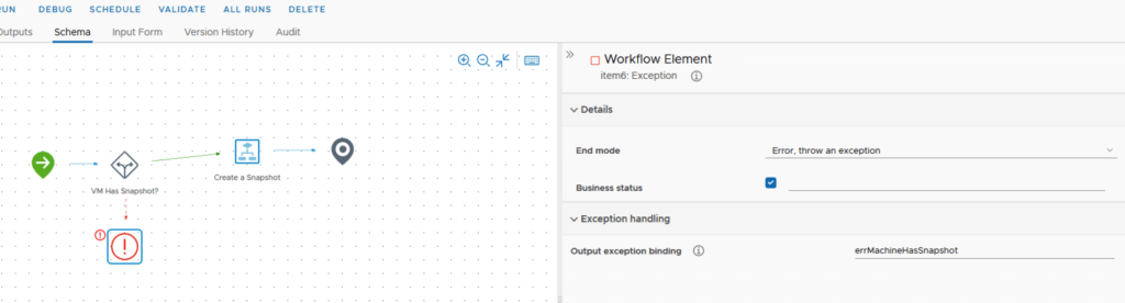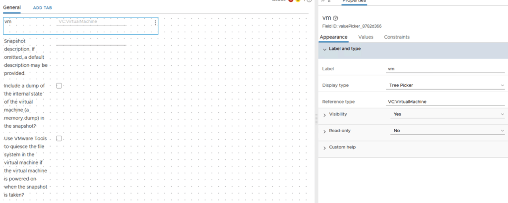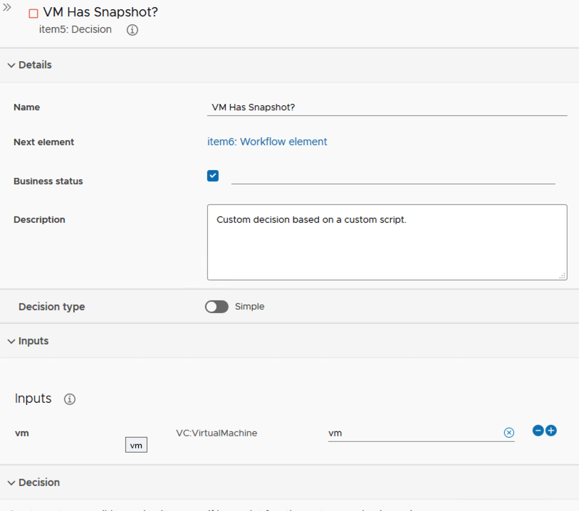 I named the first step VM Has Snapshot?. Under inputs i added vm. It would look like the screenshot below