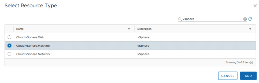 Under Resource type click on add pick Cloud.vSphere.Machine