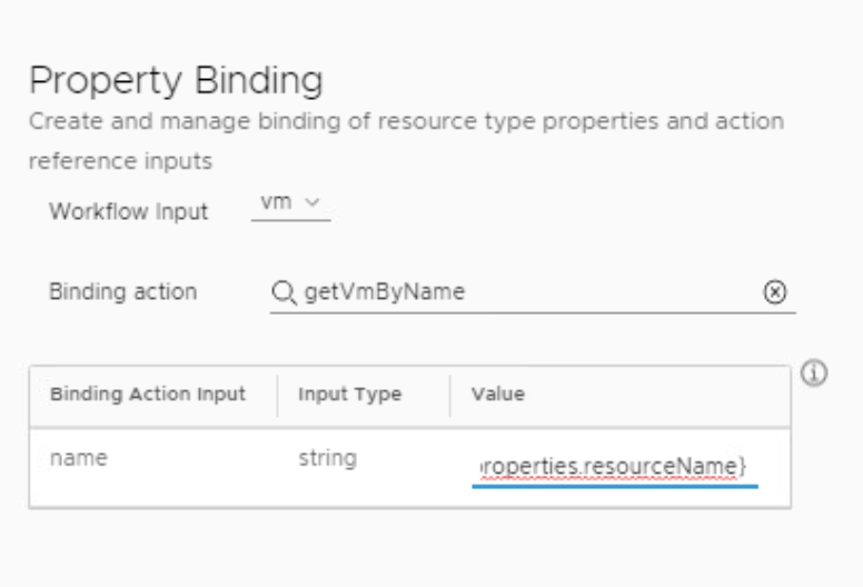 In the Property Binding pick getVmByName action and under string enter ${properties.resourceName}