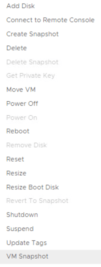 Once everything is saved we can test out the Day 2 action by going to an existing deployment and trying to create a snapshot. We can see in the menu an additional option all the way to the bottom: