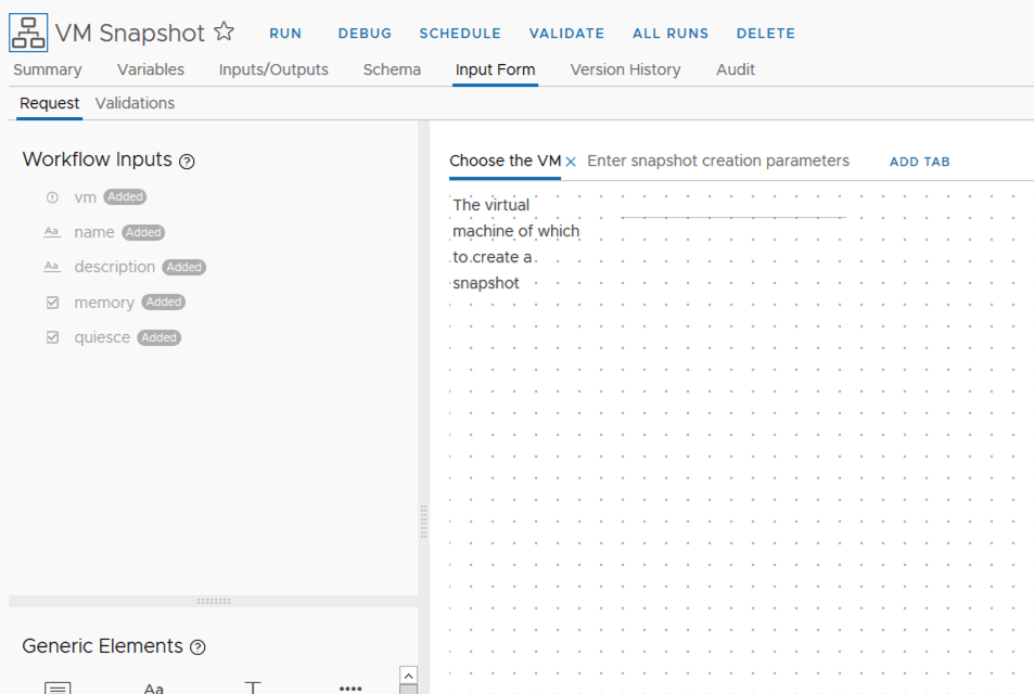 I named the first step VM Has Snapshot?. Under inputs i added vm. It would look like the screenshot below
