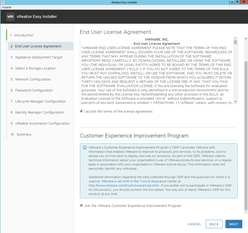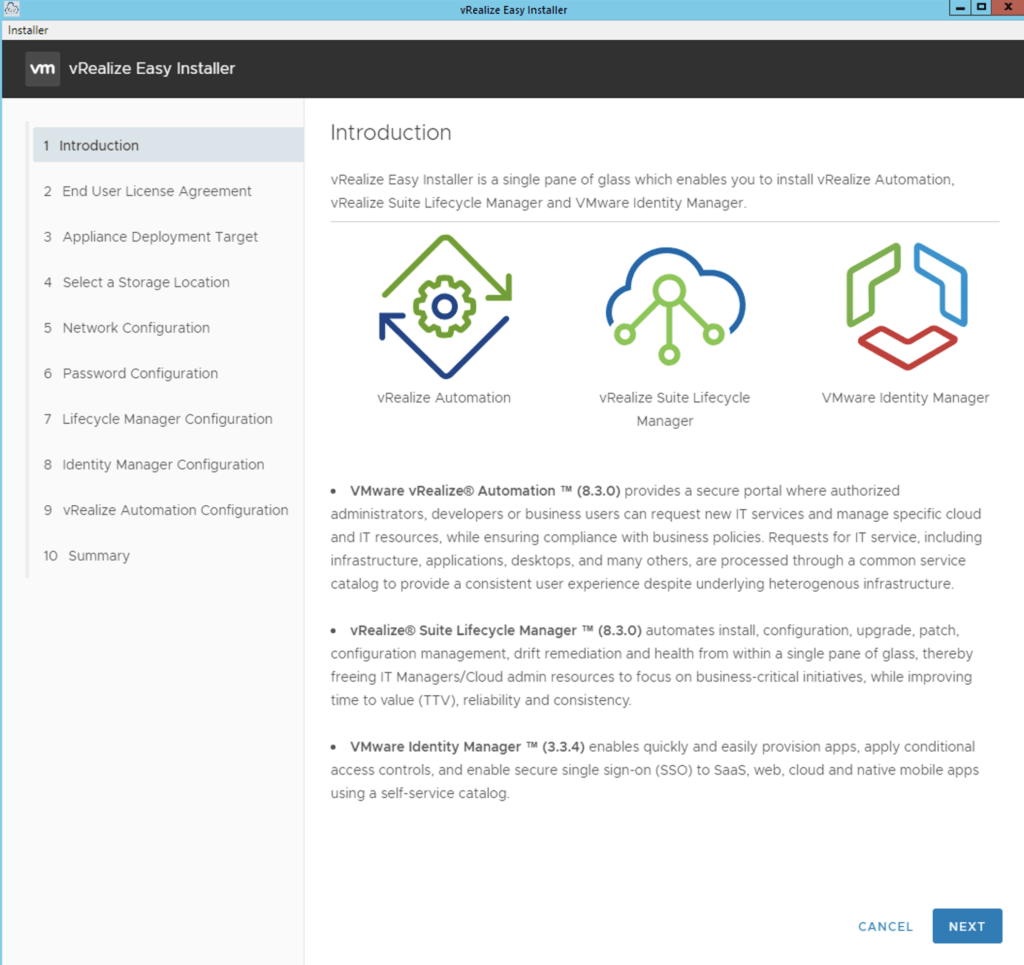 Once we click Install we will be presented with an Introduction of what components will be included part on the installation. In my case i can see vRealize Automation 8.3, Lifecycle Manager 8.3, Identity Manager 3.3.4.