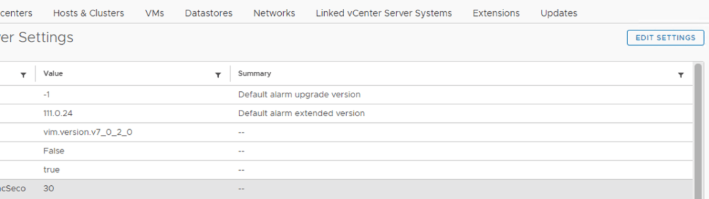 Next we need to navigate to the vCenter server -> Configure -> Advanced Settings example: