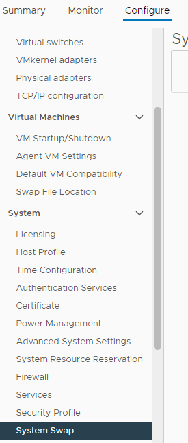 For vCenter go to the host in question to Configure -> System -> System Swap