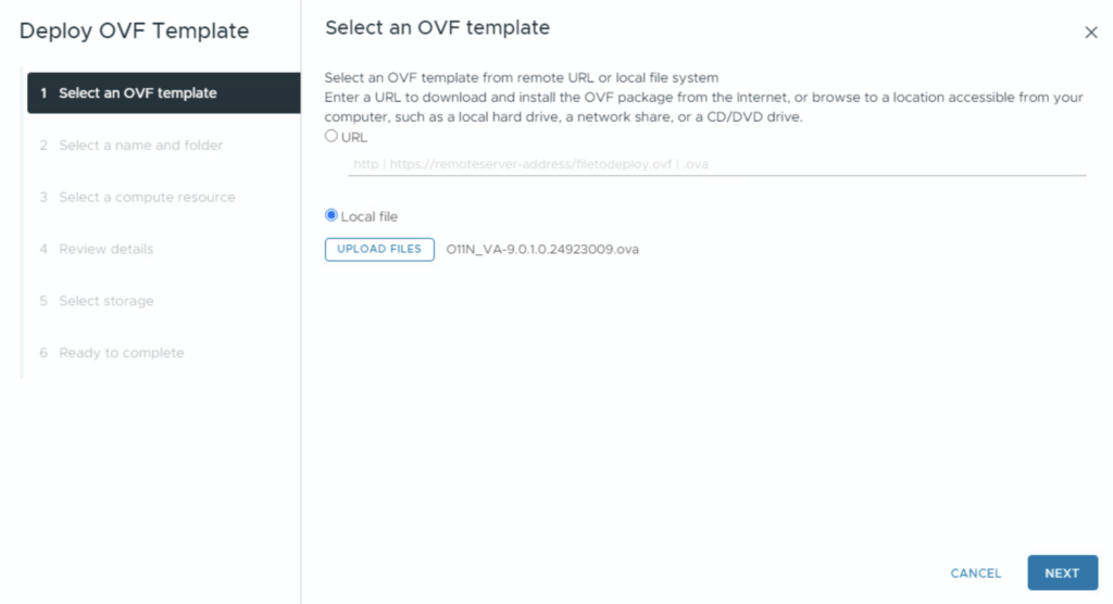 Start the Wizard: Right-click your desired cluster or host and select Deploy OVF Template. Upload the OVA file you just downloaded.