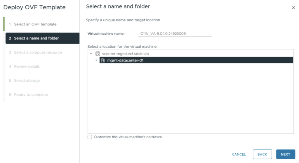 Naming: Choose a descriptive name for the VM (e.g., vcf-orchestrator-01) and select the target folder.