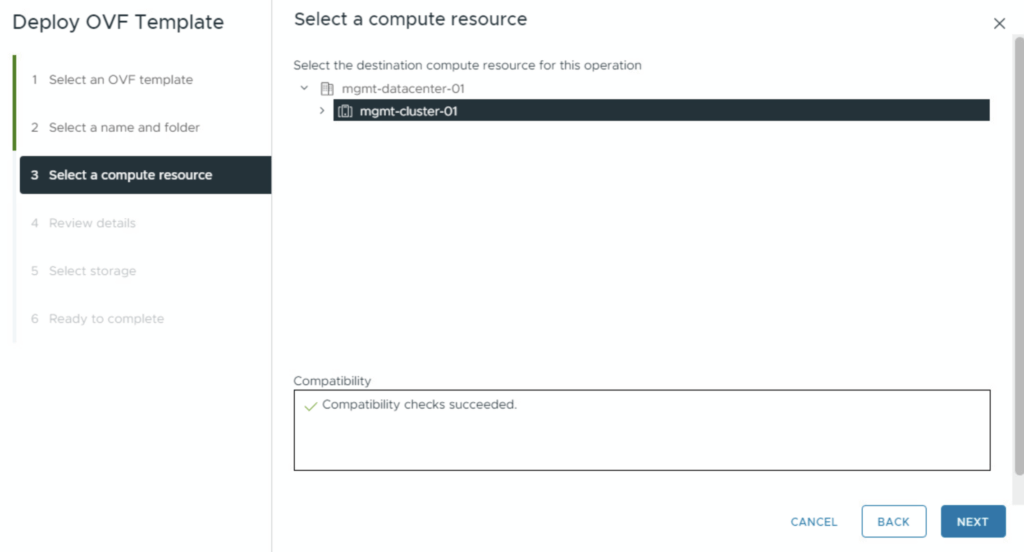 Compute: Select the compute resource (Cluster or specific Host) where the appliance will run.