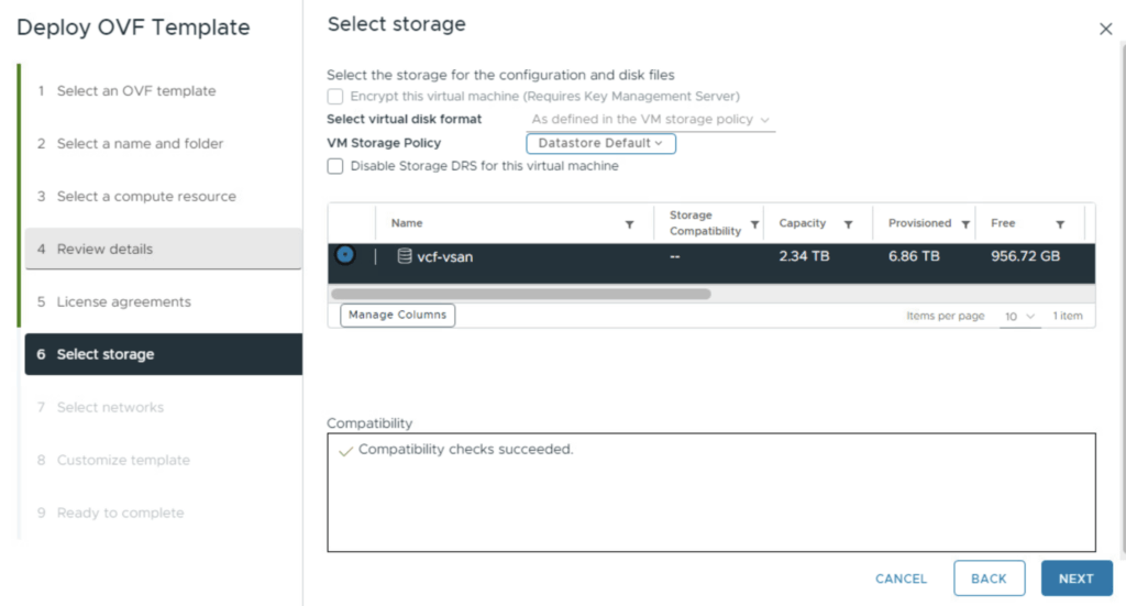 Storage: Choose your target datastore. For production environments, ensure you select a storage policy that offers redundancy.