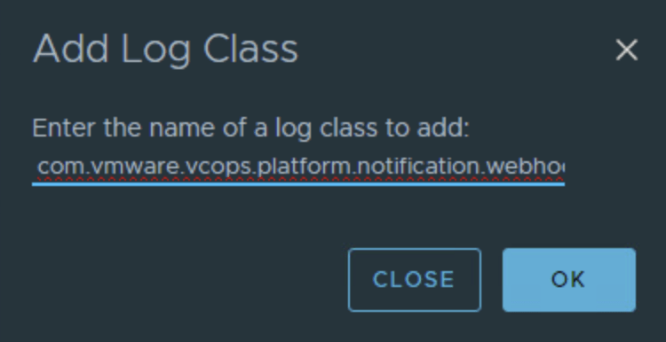 3. Add the WebhookSender Class We need to tell VCF Operations to explicitly track the webhook notification class. Click the Plus (+) sign to add a new logger class.