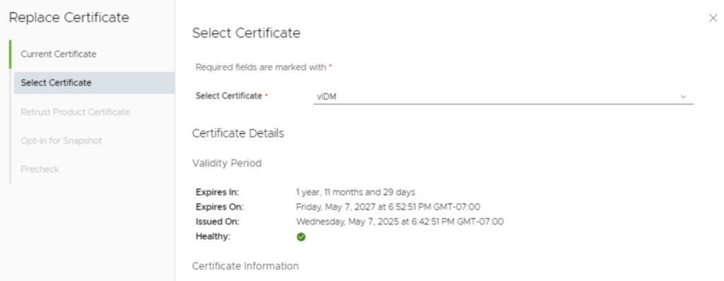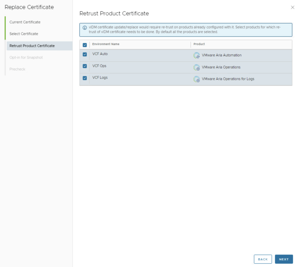 - If no other products are integrated (i.e., vIDM is standalone or nothing else is using it via LCM), this step might either be skipped or just show vIDM itself.In our case, let’s assume the default: leave all relevant products checked for re-trust. (If you had a reason to exclude one, you could uncheck it, but typically you want all to trust the new cert.)