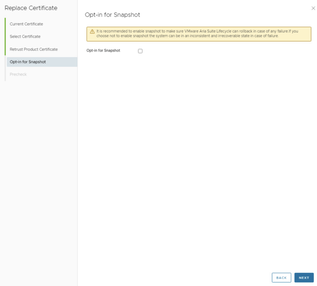 - Snapshot Option (Rollback Plan): Aria Suite LCM may offer an “Opt-in for Snapshot” checkbox during the wizard . This feature will automatically create snapshots of the vIDM appliance (and possibly other products) before applying the new certificate, in case a rollback is needed. This is particularly useful for products that don’t have an easy built-in certificate rollback. vIDM (Workspace ONE Access) is one of those products where a snapshot is recommended (because if something goes wrong with the certificate, you might need to revert to a snapshot) .