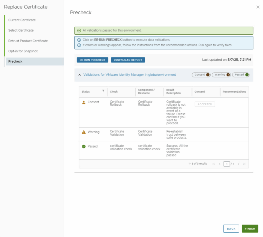 - Ensure you get a “All validations passed” message. You might see a warning about re-trusting products (highlighted in the image) – this is normal, reminding you that after the process you should verify the other products trust the new certificate . If any errors appear, address them before proceeding (for example, an error could indicate a mismatch in the certificate chain or connectivity issues).Once pre-check passes, click Finish (or Replace/Submit) to kick off the certificate replacement process.