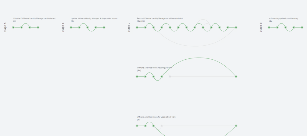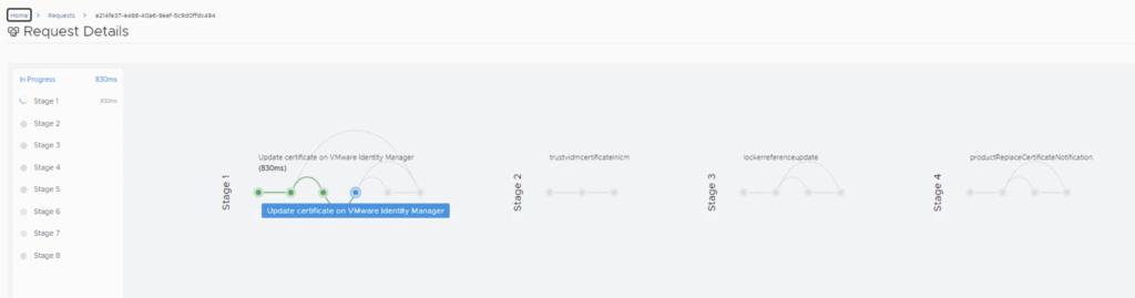 - Process Execution: Aria Suite LCM will now automate the certificate replacement. This typically involves updating the vIDM appliance’s keystore with the new certificate, restarting the vIDM service, and updating trust on each integrated product. You will see a request initiated in Aria LCM with multiple stages (tasks) executing . Monitor the progress in the UI’s request/task viewer. In 8.18, there may be around 5-6 stages (e.g., taking snapshot if chosen, installing cert on vIDM, restarting services, updating product trusts, etc.).The process can take several minutes. During this time, user logins through vIDM might be unavailable, so do this in a maintenance window.