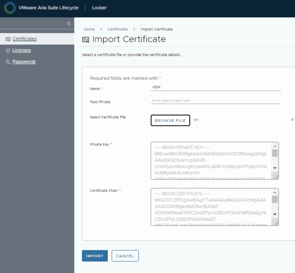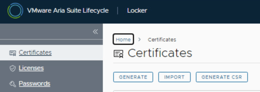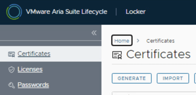 - In the Aria Suite Lifecycle UI, navigate to Home > Locker > Certificates. Click the “Import” button to import a new certificate .