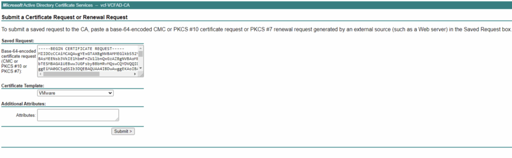 - Submit CSR to CA: Use your CA’s process for certificate requests. For example, in a Microsoft Active Directory Certificate Services (AD CS) web portal, navigate to the certificate request page (usually http://ca-server/certsrv). Choose the “Request a certificate” option, then “advanced certificate request.” Paste the Base-64 encoded CSR text (the part from BEGIN CERTIFICATE REQUEST to END CERTIFICATE REQUEST, not including the private key) into the request form . Select the appropriate certificate template if required (e.g., a Web Server or SSL template), and submit the request.