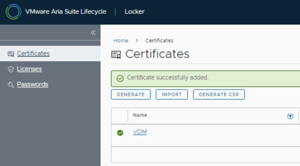 - Click Import. If the format is correct, Aria LCM will add this certificate to its list. You should see a success message and the new certificate listed in the Locker’s certificate library, likely with the name you provided . It’s a good idea to verify the certificate’s details in the Locker list (such as issuer, expiration) to confirm it’s the correct one. At this point, the certificate is stored in Aria LCM but not yet applied to vIDM – it’s just available for use. Note: If the import fails, re-check that the private key matches the certificate and that the chain is complete. A common mistake is missing an intermediate CA. Aria LCM may also validate that the certificate’s CN/SAN matches the vIDM appliance FQDN; ensure those are correct.