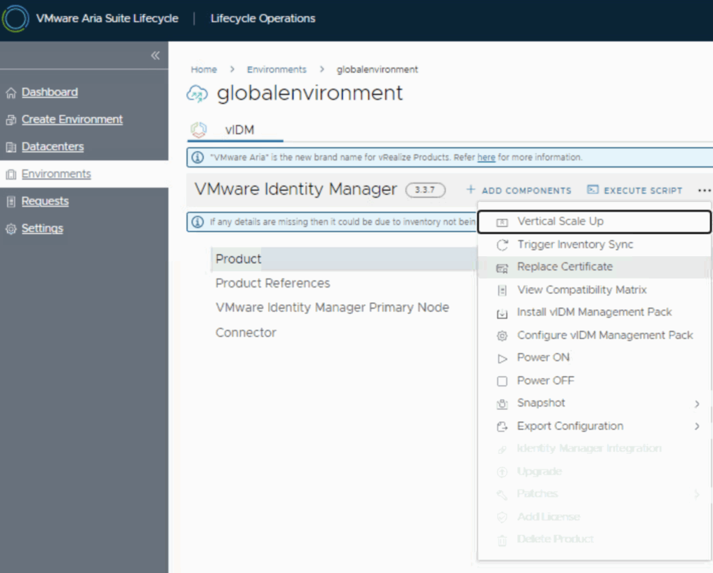 - Open the Environment: Navigate to Home > Lifecycle Operations > Environments in Aria Suite LCM. Identify the environment that contains your VMware Identity Manager. In many setups, this is the special “globalenvironment” which holds vIDM (especially if vIDM is deployed as the global SSO for other products). If you are unsure, look for an environment entry that lists VMware Identity Manager in its components. Click on the environment (or use its Actions “…” menu) and select “Replace Certificate.” (In some versions, you might first select the vIDM product within the environment, then choose Replace Certificate. In 8.18, selecting Replace Certificate at the environment level will prompt you to pick which certificate to replace if multiple are present – choose the vIDM/Workspace ONE Access instance.)