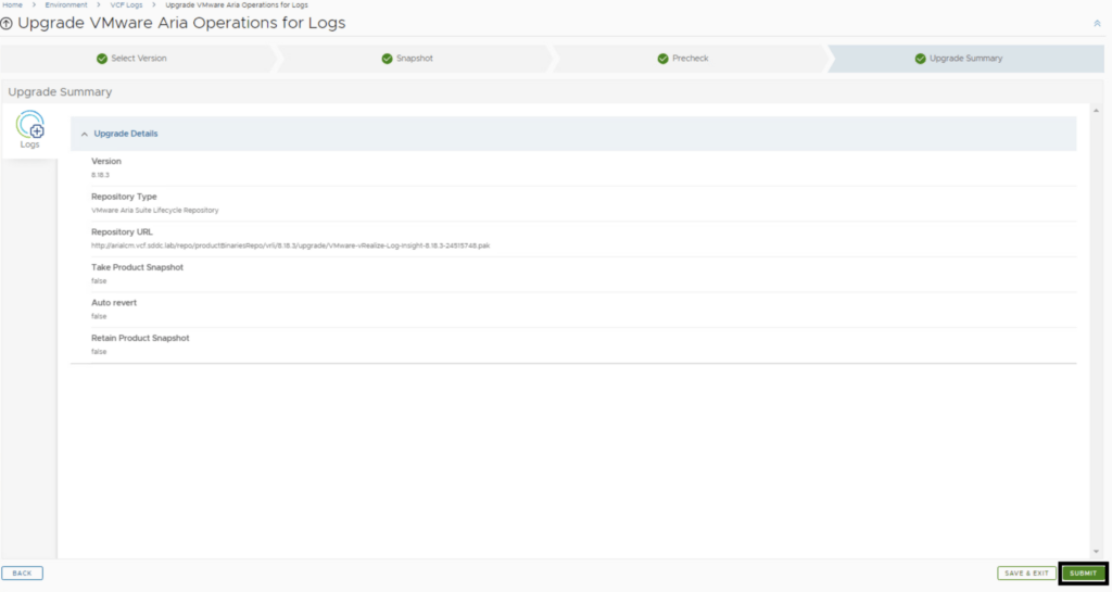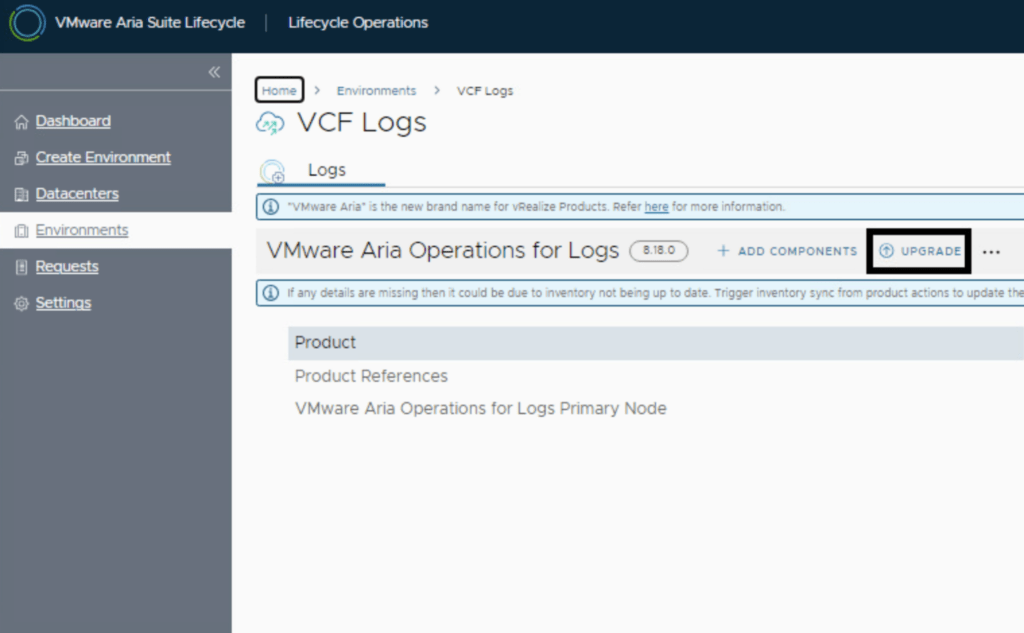 In this post I will go over upgrading Aria Operations for Logs 8.18.x appliance to 8.18.3 using Aria Suite Lifecycle. As a pre requirement we do need to have Aria Suite Lifecycle upgraded to 8.18. Instructions can be found here. The upgrade does not include the latest Product Support Pack. We can apply the latest Product Support Pack following the guide here.