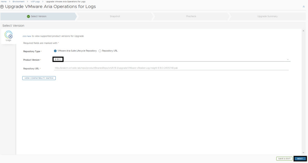 Select product Version 8.18.3 and click Next. We can also review the compatibility matrix to make sure the environment is compatible.