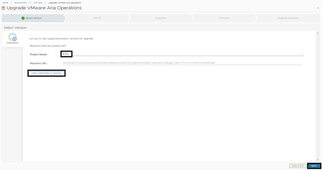 Select product Version 8.18.3 and click Next. We can also review the compatibility matrix to make sure the environment is compatible.