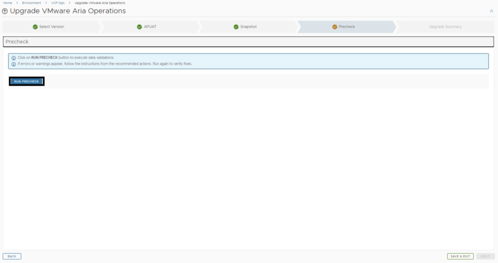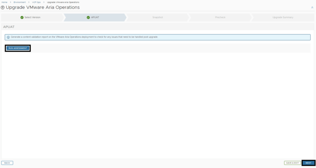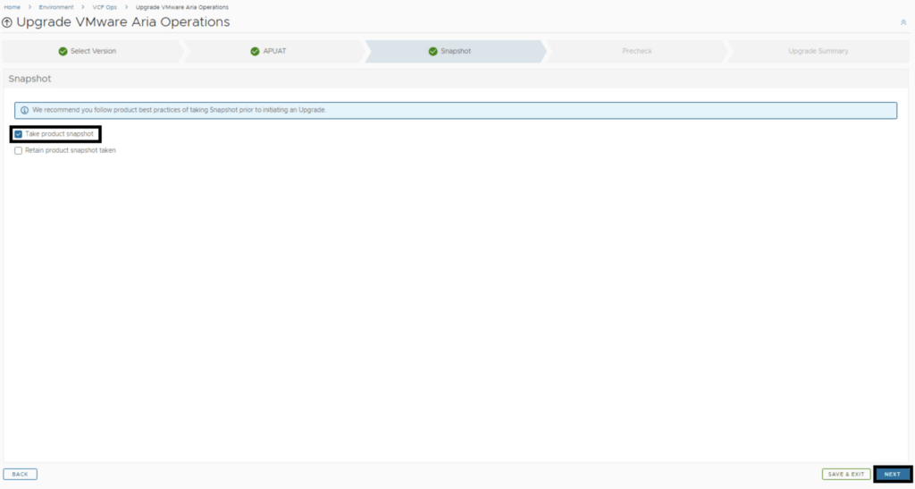 A new feature that was added was the capability to automatically create a snapshot prior to the upgrade and remove it after the upgrade. On this screen we also have the ability to choose if we want to keep the snapshots post upgrade for validation testing for example. Click Next