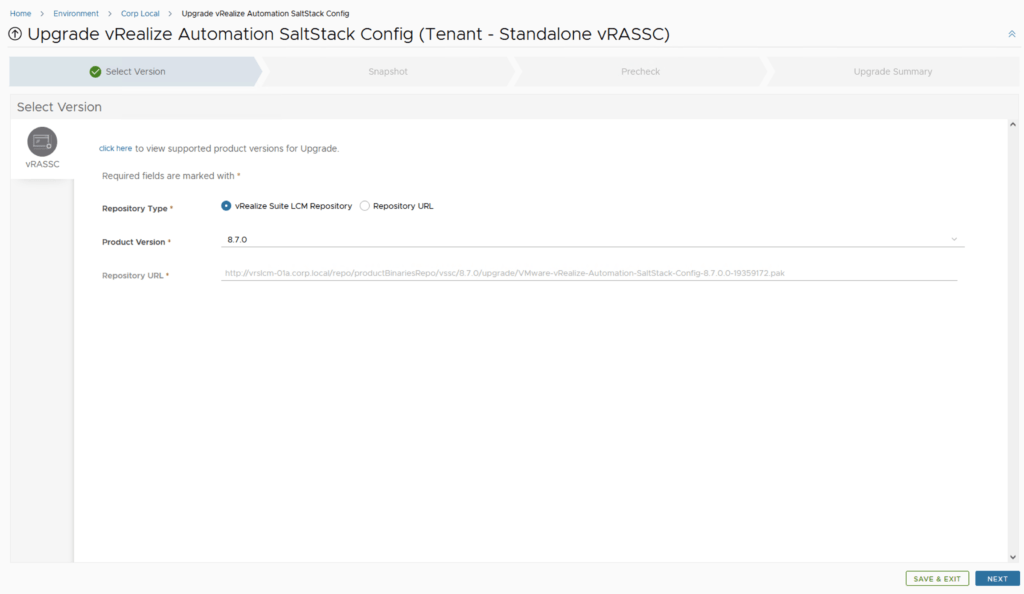 Select product Version 8.7.0 and click Next. We can also review the compatibility matrix to make sure the environment is compatible.