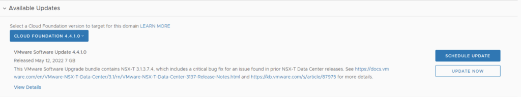 Next step is to upgrade NSX-T installation to NSX-T 3.2.1. The release notes can be found here. We can go to Lifecycle Management -> Bundle Management -> Download now. The 4.5 release actually comes with NSX-T 3.1.3, however because I haven’t upgraded my environment yet, I need to get to 3.1.2 first. The 3.1.3 release notes can be found here and the process is the same.