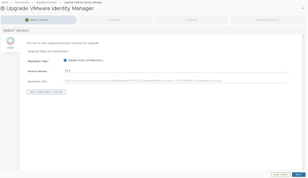 Select product Version 3.3.5 and click Next. We can also review the compatibility matrix to make sure the environment is compatible.