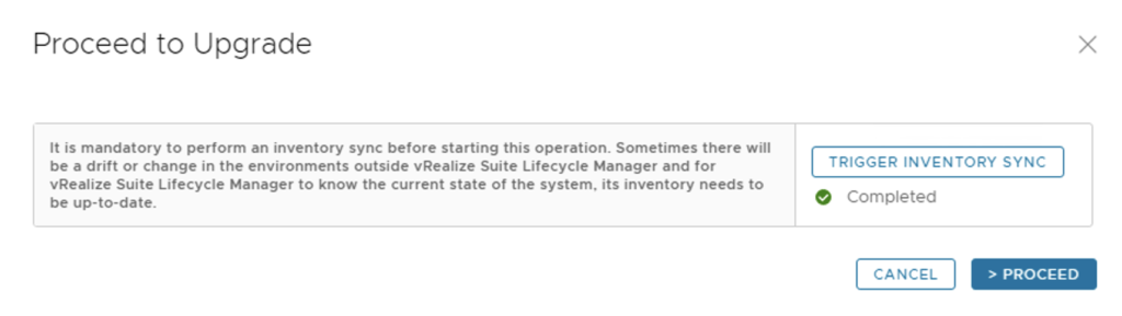 An Inventory sync is required when performing vIDM upgrades. We trigger the sync from the UI and click on Proceed once completed to continue