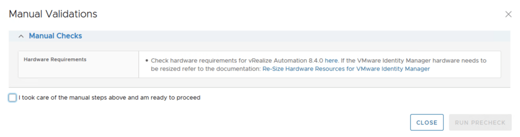 Since we already checked the sizing while the download was occurring we can check the check box for I took care of the manual steps above and am ready to proceed and click on run precheck