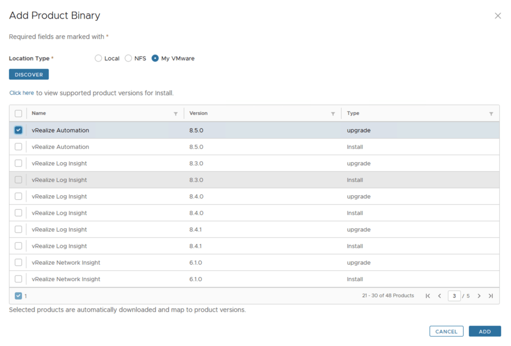 To get started we can go to vRealize Lifecycle Manager -> Lifecycle Operations -> Settings -> Binary Mapping. (If you havent added your My VMware credentials you will need to do that first by going to vRealize Lifecycle Manager -> Lifecycle Operations -> Settings -> My VMware)