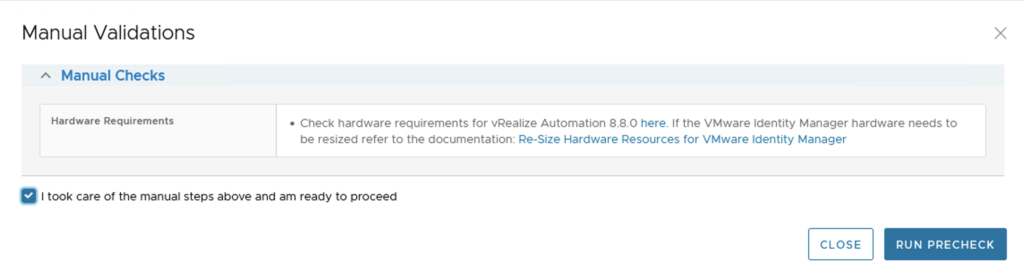 The next screen remind us of hardware requirements for vRA and vIDM which can be checked here for vRA and vIDM which can be checked here. As far as i can tell they haven’t changed since the 8.3 release. Check the I took care of the manual steps above and am ready to proceed check mark and click on Run Precheck