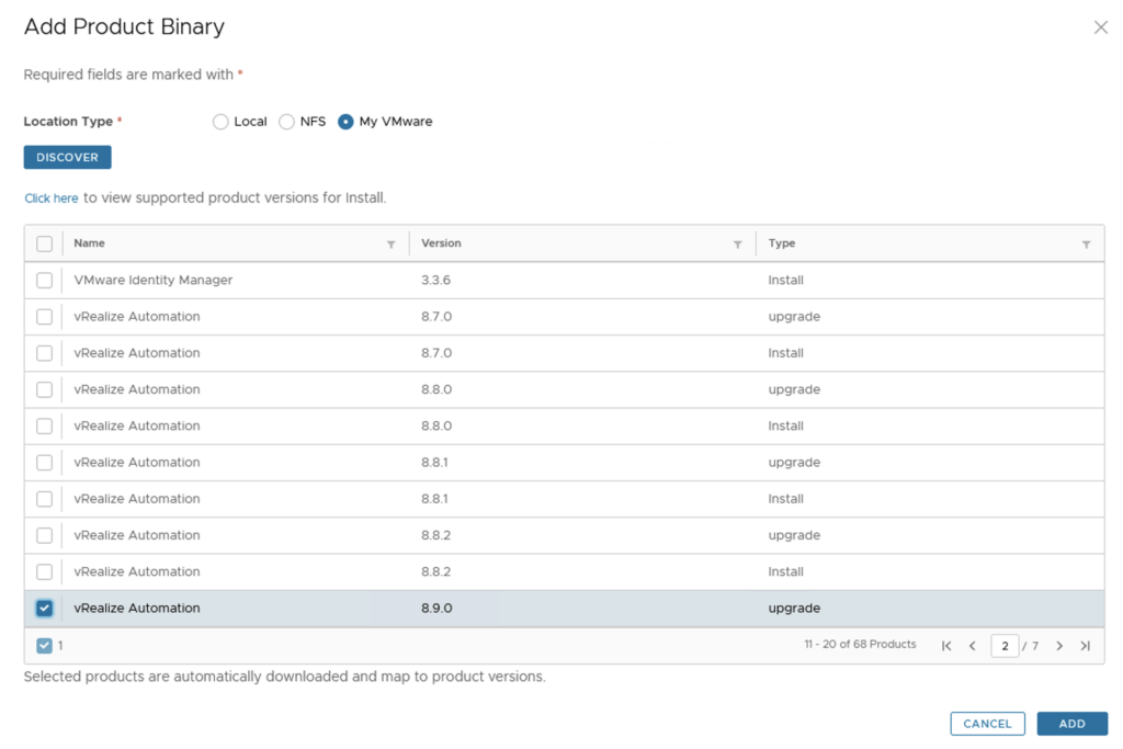 To get started we can go to vRealize Lifecycle Manager -> Lifecycle Operations -> Settings -> Binary Mapping. (If you haven’t added your My VMware credentials you will need to do that first by going to vRealize Lifecycle Manager -> Lifecycle Operations -> Settings -> My VMware)