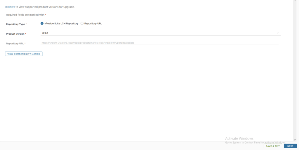 Select product Version 8.9.0 and click Next. We can also review the compatibility matrix to make sure the environment is compatible.