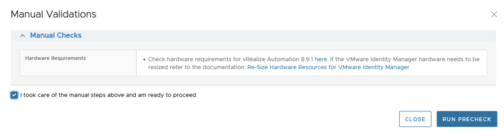 The next screen remind us of hardware requirements for vRA and vIDM which can be checked here for vRA and vIDM which can be checked here. As far as i can tell they haven’t changed since the 8.3 release. Check the I took care of the manual steps above and am ready to proceed check mark and click on Run Precheck