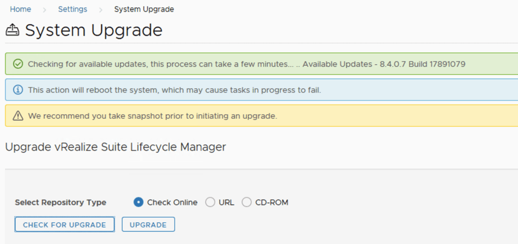 In this guide i will go over the steps of getting an existing 8.x vRSLCM appliance upgraded to the latest 8.4 release. The release notes can be found here