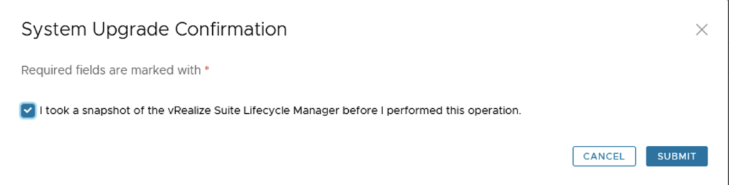 Verify that a snapshot or backup exists in case the process fails. Check the check mark for I took a snapshot of the vRealize Suite Lifecycle Manager before I performed this operation. Click Submit