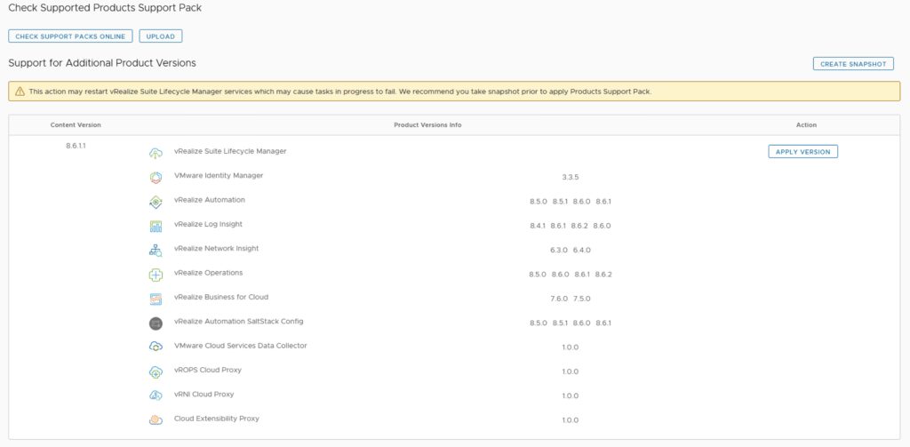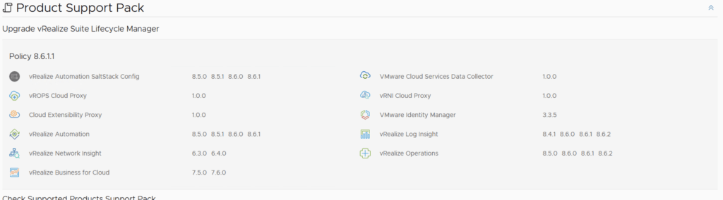 We can see that i recently upgraded to 8.6 however a new update is available 8.6.0.1. Based on what we can see in the details the new support pack adds support for vRA 8.6.1. If an update is not available click on the Check Support Packs Online button and refresh the screen within a few minutes
